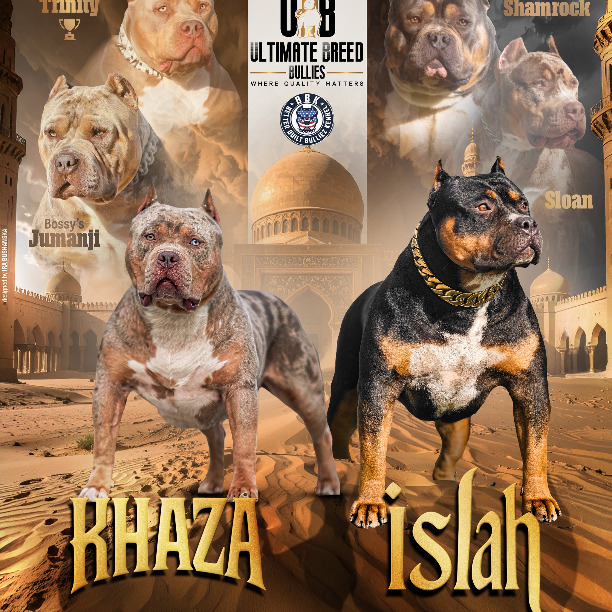 This Legacy Litter was carefully planned by pairing two powerhouse XL American Bullies, combining legendary bloodlines for unmatched size, muscle, and structure. Khaza is the son of the legendary Bossy’s Jumanji, and his DAM is the iconic FSB’s Champion Trinity, making him a direct product of proven foundation stock. On the other side, Islah’s SIRE is Grand Champion Shamrock, and her DAM is the iconic BBK’s Sloan, a name respected throughout the bully community worldwide. This breeding was designed to compact massive bone, blocky heads, and dense muscle into balanced frames while maintaining top-tier temperament and drive. The result is a litter stacked with Tri and Merle XL American Bullies that carry elite bloodlines, championship credentials, and the signature look serious breeders and families demand.